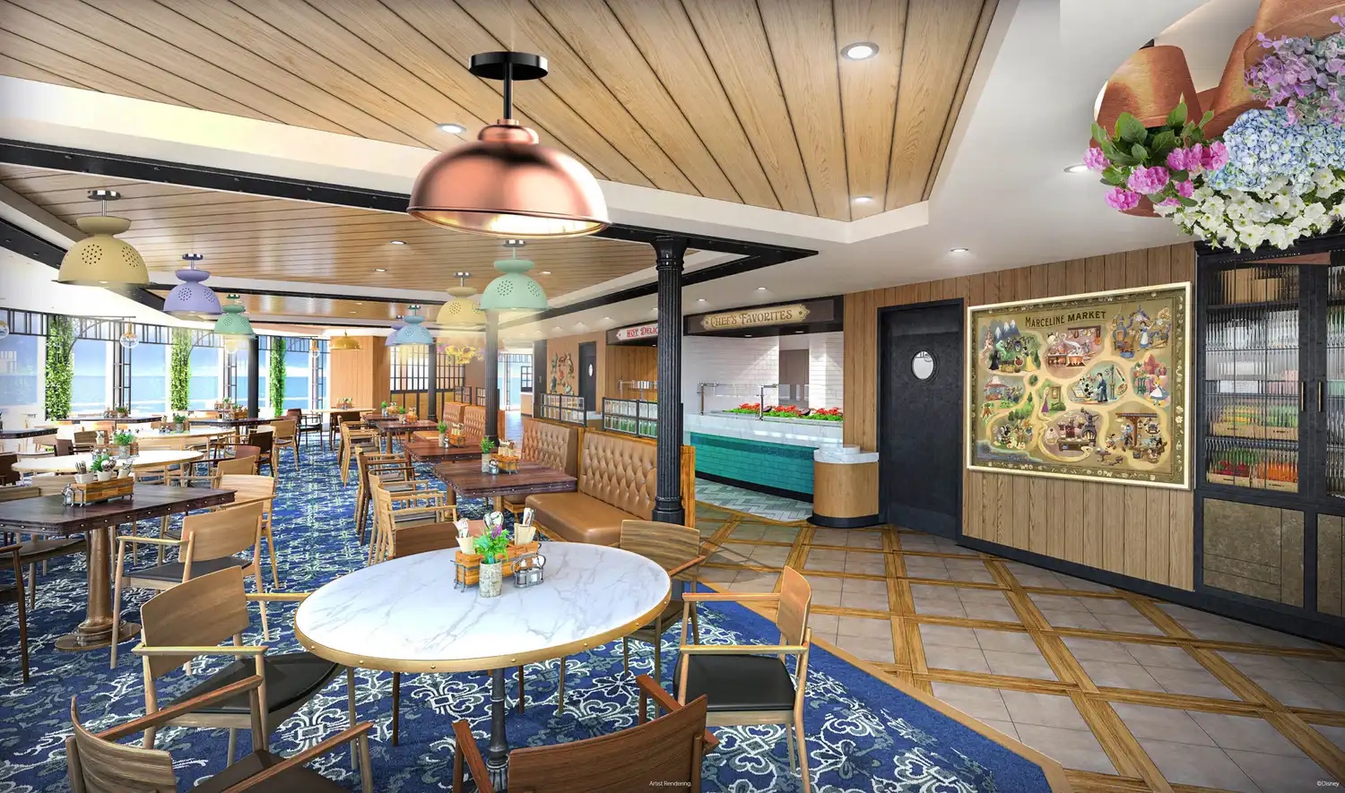 Which speaking of buffet, on the Disney Wish, Cabanas has been redesigned into Marceline Market, but to be honest, this felt like Cabanas (or any other cruise buffet I’ve been to) but it’s nice to have newer theming and I loved the front area with the coffee shop and more lounge style seating.
